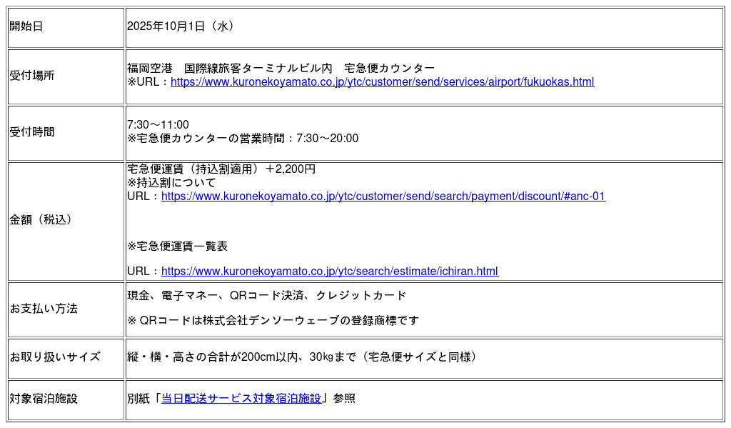 九州旅客鉄道株式会社(本社:福岡県福岡市、代表取締役社長:古宮 洋二、以下:JR九州)とヤマト運輸株式会社(本社:東京都中央区、代表取締役社長:阿波 誠一、以下:ヤマト運輸)は、2025年10月1日(水)から、福岡空港国際線ターミナルでお預かりした手荷物を、熊本県と鹿児島県の宿泊施設へ当日中にお届けするサービスを開始します。