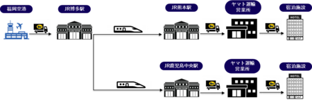ヤマト運輸の「福岡空港 国際線旅客ターミナルビル内 宅急便カウンター」でお預かりしたお客さまの手荷物を、ヤマト運輸がトラックでJR博多駅まで輸送します。その後、JR博多駅を出発する新幹線に荷物を積み替え、客貨混載にてJR熊本駅とJR鹿児島中央駅へ輸送します。駅に到着後、ヤマト運輸のトラックに積み替え、配送先最寄りのヤマト運輸の営業所を経由して、18:00以降に対象宿泊施設へお届けします。