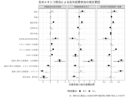 一方で、メキシコ政府への信頼感が強い場合には、有権者身分証の取得(①)のみで参加が促されました。これは、母国政府への信頼にもとづく投票意欲が②・③の段階まで持続しないと解釈できます。