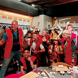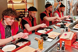 戦国時代さながらの店内では、侍の衣装を身につけ寿司握りや日本の食文化を学べます。また、職人の “日本刀巻き寿司パフォーマンス”や“出汁巻き実演 ” は大迫力で日本の忘れられない思い出作りとして外国人観光客を虜にしています。