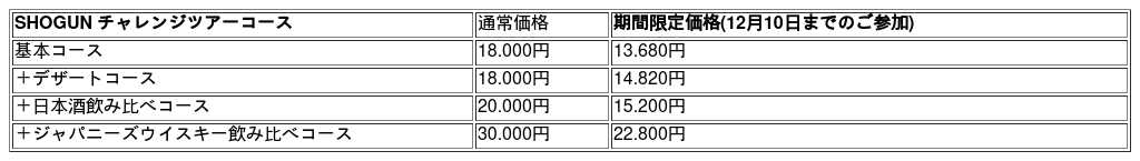 ・SHOGUN チャレンジコース:《11:00~》、《18:30~》