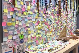 特に印象的なのが、壁一面に貼られた色とりどりの付箋たち。来場者が自由にメッセージを残せるこのスペースには、「沈まないでツバル」「また未来の万博で会いましょう」「できることをするよ」「あきらめないで」といった応援の言葉がぎっしりと並びます。その一枚一枚は、誰かのまなざしや祈りの証であり、小さな共感の積み重ね。