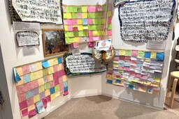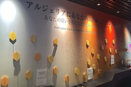 展示を眺めるだけでなく、自らの言葉を「残す」体験。派手な演出があるわけではありませんが、その静けさが、深い集中を生み出します。「持続可能な世界に」「アルジェリアに幸あれ」「世界中が仲良くなれますように」などと展示を見た感想、自分の希望、誰かへの励ましの言葉が、穏やかに壁を彩っています。会場内は比較的ゆったりとしており、ほとんどの来場者が足を止め、時間をかけて思いをつづっていく姿が印象的でした。