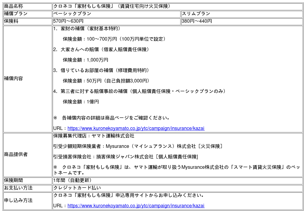 ヤマト運輸株式会社(本社:東京都中央区、代表取締役社長:阿波 誠一、以下:ヤマト運輸)は、2025年10月9日(木)から、賃貸住宅向け火災保険「クロネコ「家財もしも保険」」の販売を開始します。