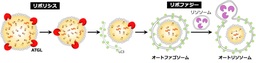 オートファジーによる脂肪滴分解。脂肪滴を含んだオートファゴソームがリソソームと融合することによって、分解が進行する。