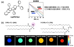 図2.(a) LipiPB Redの構造と環境応答性。(b) LipiPB Redを用いた人工脂肪滴の蛍光寿命イメージング。