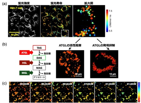 次に、LipiPB Redによってさまざまな細胞種に含まれる脂肪滴を染色し、その様子をFLIMによって観察しました。その結果、肝臓がん細胞株であるHepG2細胞とHuh-7細胞中に存在する脂肪滴では蛍光寿命が一様ではなく、同じ細胞内であっても脂質組成に不均一性があることを発見しました(図3a)。興味深いことに、この不均一性は肝臓がん細胞特有の現象であり、HeLa細胞(ヒト子宮がん)やCOS-7細胞(サル腎)、脂肪細胞などでは認められませんでした。さらに、TAGからDAGへの加水分解を担うリパーゼであるATGLの活性を阻害したり、siRNAによってATGLの発現を抑制したりすると、この不均一性は消失(色が均一化)しました(図3b)。その際、DAG/TAG比の減少に伴う長い蛍光寿命が細胞全体で観察されたことから、ATGLが脂肪滴ごとの代謝状態の違いを生み出す鍵酵素であることが示唆されました。また、LipiPB Redで染色した脂肪細胞に対して脂肪分解を促進するフォルスコリン(注8)を投与し、その過程をFLIMで追跡したところ、脂肪滴サイズの縮小とともに、一様だった蛍光寿命が経時的に不均一になっていく(色の分布が広くなる)様子が観察されました(図3c)。これは、脂肪滴ごとに分解の進行度が異なることを示しています。このように長時間にわたり脂肪滴の動態を1細胞レベルで追跡できたのは、超耐光性を示すLipiPB Redの大きな利点の一つです。