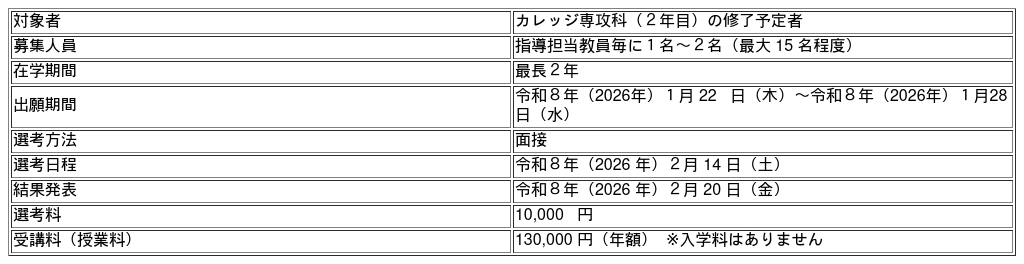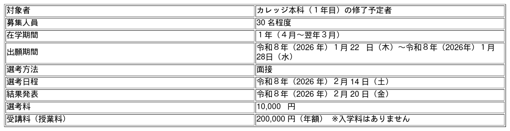 募集内容(出願方法を含む)及びカレッジ(カリキュラム等)の詳細