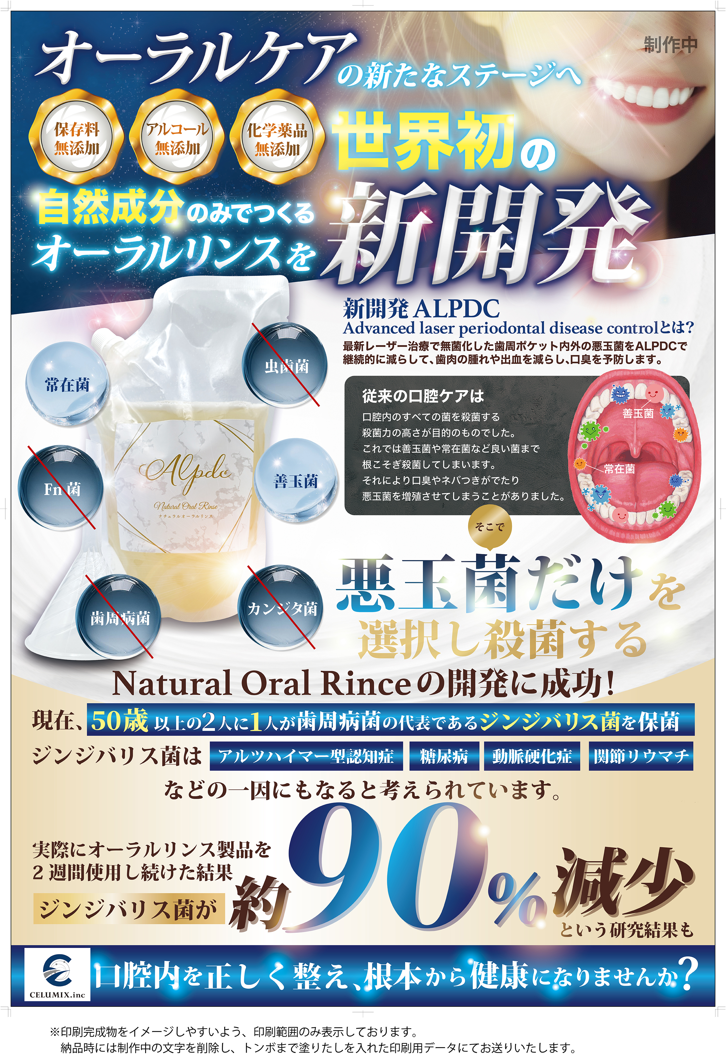 ALPDC™は“すべてを殺す”のではなく、口腔フローラの最適化を志向。悪玉の過増殖を選択的に抑え、善玉菌の育成を目指すアプローチです。ここに、ブルーラジカルP-01(非侵襲・短時間を志向する先進ケア)を院内で統合し、口内での即効性と持続性の橋渡しを図りました。