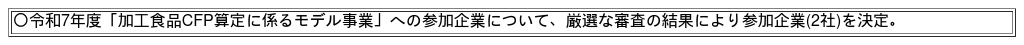 令和7年9月1日(月曜日)から同年9月30日(火曜日)まで参加企業を募集していた「加工食品CFP算定に係るモデル事業」について、算定における社内体制、算定目的、対象製品、取組内容についての発信協力等を総合的に検討し、次の2社を参加企業として決定しました。