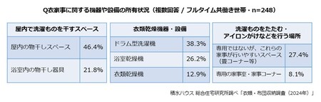 次に、衣家事に関する機器や設備について聞いたところ、外干し以外で洗濯ものを乾かすことを想定して、屋内の物干しスペースや機器・設備を設けている人も多いことがわかりました。「屋内の物干しスペース」は46.4%、乾燥機能が充実した製品が多い「ドラム型洗濯機」は38.3%、「浴室乾燥機」は26.2%が所有していると回答しました。