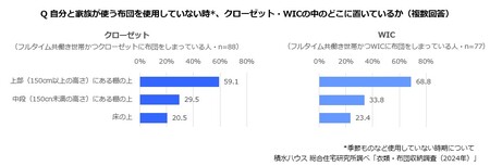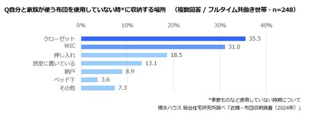 続いて、衣類とともに収納の大きなスペースを占める布団についても、収納場所や収納方法を聞きました。収納場所について、自分と家族が使う布団のうち、季節ものなど使用していない時期の布団は「クローゼット」35.5%、「WIC(ウォークインクローゼット)」31.0%と、クローゼットにしまっている人が多いことがわかりました。