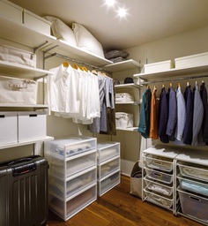 とくにベッド就寝のお住まいでは、押し入れや納戸、クローゼット内に布団をしまうための中段(腰から胸ほどの高さの奥行のある棚)を設置していない人も多いのではないでしょうか。そのようなお住まいでは、季節外の布団や来客用の布団などは、コンパクトにまとまる収納ケースや収納袋などを活用し、枕棚(高い位置の棚)に省スペースで収納しましょう。そうすることで、クローゼットの空間を最大限に活用でき、ハンガー収納のためのスペースを広く確保することも可能になります。