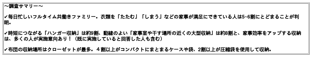 今回の調査では、フルタイム共働き世帯、とくに子育てファミリーは、衣家事が満足にできていないと感じている人が多いことがわかりました。そのような中で、時短や家事負担軽減につながる衣類の「ハンガー収納」や「家事室や干す場所の近くの大型収納」に対する実施意向が高いことも明らかになりました。忙しい毎日の中で、できるだけ効率的に家事を済ませたいというニーズが読み取れます。