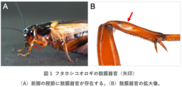 昆虫類にも私たちヒトと同様に、視覚、聴覚、嗅覚、味覚、触覚などを担う感覚器官があります。視覚を担うのは、昆虫では主に複眼です。それでは聴覚はどうでしょうか?例えばコオロギやキリギリスでは、前脚の脛節に楕円形の鼓膜器官があって、これがヒトの耳の鼓膜のように働いて音を感受します(図1)。セミ、バッタ、ガ、カマキリなどは胸部や腹部に鼓膜器官があり、音や振動を感受します。このように、昆虫類の聴覚器官はきわめて多様であり、独立に繰り返し進化したと考えられています。