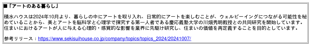 積水ハウス株式会社(以下「積水ハウス」)は、住まいにおける新たな価値提供を目指し、「アートのある暮らし」のサービス化に向けた価値検証プロジェクトを開始いたしました。