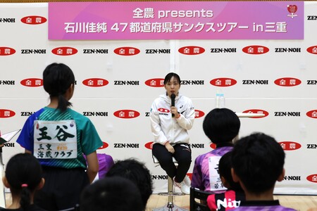 「石川佳純47都道府県サンクスツアー」(企画:IMG)は、石川さんが全国各地の方々との交流を通じて、卓球の魅力やスポーツの楽しさを伝えることを目的として企画されたもので、令和4年4月にスタートしました。本イベントは今回で41回目の開催となり、全農主催は6月に開催された岩手教室に続き11回目となりました。世界の舞台で戦ってきた石川さんがご自身の経験をもとに、トークショーや実技指導を通して健康で強い心と体を持つ選手になるために重要な「心技体」について三重県の子どもたちに伝えました。