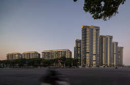 中低層建物が密集する都心の街区に建つため、開口部や色彩の調整により、バルコニーが持つ生活感を和らげ、周辺環境のスケールと穏やかに調和する外観を形成しました。都市生活者が求める、他者の存在を感じながら緩やかな関係性を育む共用ラウンジは、入居者が自由に利用できる空間として設けられています。また、周辺住民にとっても憩いの場となる前面の緑化空間は、都市に共生の風景をもたらしています。