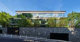 周囲の緑を映し出す「1 枚のガラス」で公私の境界を構成し、敷地内外の緑地の重ね合わせ、濃淡、距離で視線を制御していします。連続する大開口からの風景の取り込みで居住空間の豊かさを実現しました。擁壁は、石の厚みと種類を変えることで、上部の樹木をより際立たせています。富裕層向け集合住宅にありがちな閉鎖的な構えに対し、豊かな緑と石垣が織りなす地域特有の風景を継承し、住み手だけでなく地域に暮らす人びとの「共有資産」となりうる佇まいを追求しました。