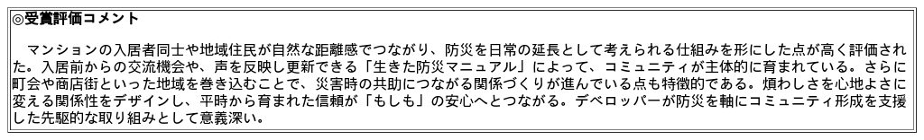 契約者懇親会により入居前から「顔が見える交流」を促進し、入居後は入居者の声を反映した更新可能な「生きた防災マニュアル」を作成。町会・商店街との連携を通じて「対話と共助の機会」を生み出し、管理費に防災費を組み込むことで活動の持続性も確保しています。