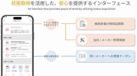 ・家電が故障した場合、アプリ上にアラートを表示。感知した家電修理サイトやエディオン会員サイトに遷移して、電話やWebから修理の依頼が可能です。