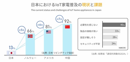 近年、共働きや核家族の増加など、家事や生活の効率化が求められる中で、家電とインターネットが融合したIoT家電は、忙しい現代人をサポートする新たなライフインフラとして注目されています。その一方で、中国(92%)やアメリカ(81%)に比べ、日本でのIoT家電の普及率は約13%と低く、「設定が難しい」「操作が煩雑」「メーカーごとに異なるアプリが必要」といった課題が導入を阻んでいます。