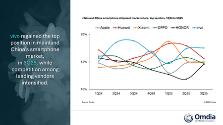 ロンドン--(BUSINESS WIRE)-- (ビジネスワイヤ) -- オムディアの最新調査によると、2025年第3四半期(3Q25)の中国本土のスマートフォン市場は前年同期比3%の縮小となりました。市場は調整局面が続くなか、主要メーカー間の競争は激化を見せ、上位メーカー間の出荷台数の差は狭まってきています。vivoは1,180万台を出荷し、18%の市場シェアを獲得して首位に返り咲きました。Huaweiは1,050万台(市場シェア16%)で僅差の2位となりました。アップルは出荷台数1,010万台と前四半期の好調を維持しており、前年同期と比較して2ランク上昇し再びトップ3にランクインしています。Xiaomiは出荷台数1,000万台で4位、OPPOが990万台で5位となり、トップ5を締めくくりました。