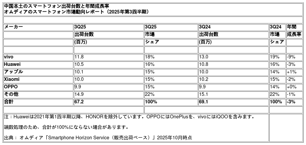「市場は2四半期連続で縮小したものの、減少幅が縮小していることから、年初の政府補助金プログラムによって引き起こされた不安定な出荷状況が終息に向かっていることが示されており、市場は徐々に正常化しつつあります」と、オムディアのアナリストであるLucas Zhongは述べています。「出荷ペースがより慎重な動きをみせたことで、メーカーは適正な在庫水準を維持できており、フラッグシップモデルの発売、「ダブル11」のショッピングシーズンを控え、新たな補助金政策が打ち出される可能性もあるなか、第4四半期は活発な動きが期待されます。同時に、メーカー各社は長期を見据えた戦略的な動きも進めています。今年初めのPura X発売以降、Huaweiは主要な新モデルにHarmonyOS 5.0をプリインストールしています。この移行はソフトウェア最適化やユーザー体験において短期的な課題をもたらしますが、一貫した運営により、特に飽和が進む市場においてHuaweiのエコシステムにおける参入障壁が強化される見込みです。」