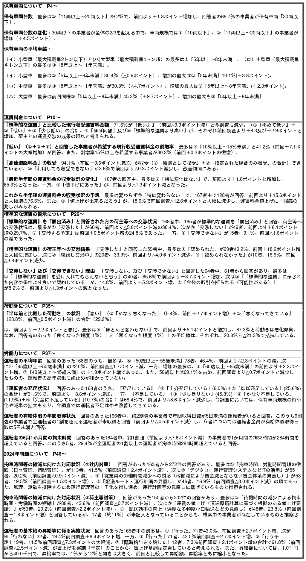 (2)第43回「運賃動向に関するアンケート調査」の調査内容は、第42回「運賃動向に関するアンケート調査」の基本調査項目は踏襲しつつ、標準的な運賃の届出状況、半年間で荷主から一方的に取引を断られたことの有無、半年後の主要荷主の荷動きの動向、定年制度の有無、定年年齢及び統合による設問のスクラップを行い調査項目を削減した。