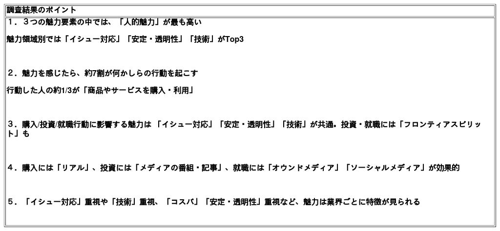 行動につながる共通の魅力領域として、「イシュー対応」と「安定・透明性」「技術」があるということが分かりました。また購入/投資/就職の各行動によって、生活者が感じる魅力が異なっているという事実は、目的とするアウトカム(魅力を感じた後にしてほしい意識変化/行動変容)によって、伝えるべき魅力コンテンツの最適化につながると考えられます。
