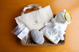 バスローブ、スリッパ風トイ、おやつ、トートバッグを、1回のご滞在で1匹につき1セットお渡しいたします。ご滞在中はもちろん、ご自宅に帰った後も、愛犬とのお散歩や遊びにご利用いただけます。