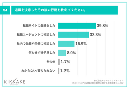 Q3で「わからない/答えられない」以外を回答した方に、「Q4.退職を決意したその後の行動を教えてください。」(n=402)と質問したところ、「転職サイトに登録をした」が39.9%、「転職エージェントに相談した」が32.3%、「社内で先輩や同僚に相談した」が16.9%という回答となりました。