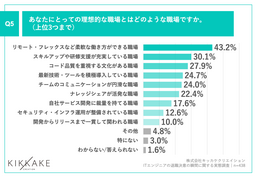 「Q5.あなたにとっての理想的な職場とはどのような職場ですか。(上位3つまで)」(n=438)と質問したところ、「リモート・フレックスなど柔軟な働き方ができる職場」が43.2%、「スキルアップや研修支援が充実している職場」が30.1%、「コード品質を重視する文化がある職場」が27.9%という回答となりました。