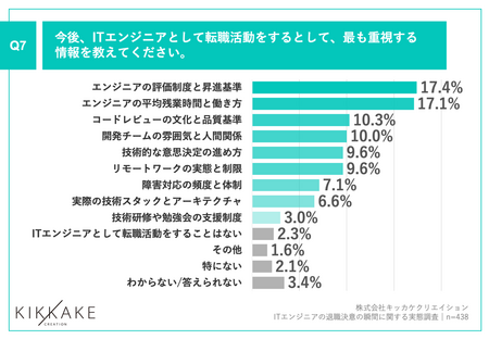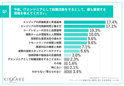 「Q7.今後、ITエンジニアとして転職活動をするとして、最も重視する情報を教えてください。」(n=438)と質問したところ、「エンジニアの評価制度と昇進基準」が17.3%、「エンジニアの平均残業時間と働き方」が17.1%、「コードレビューの文化と品質基準」が10.3%という回答となりました。