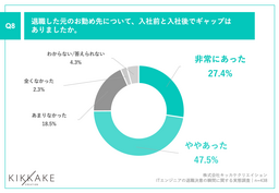 「Q8.退職した元のお勤め先について、入社前と入社後でギャップはありましたか。」(n=438)と質問したところ、「非常にあった」が27.4%、「ややあった」が47.5%という回答となりました。