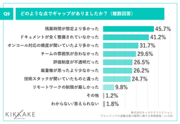 Q8で「非常にあった」「ややあった」と回答した方に、「Q9.どのような点でギャップがありましたか?(複数回答)」(n=328)と質問したところ、「残業時間が想定より多かった」が45.7%、「ドキュメントが全く整備されていなかった」が41.2%、「オンコール対応の頻度が聞いていたより多かった」が31.7%という回答となりました。