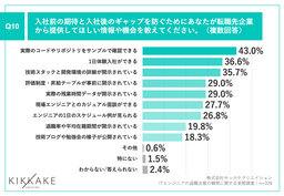 Q8で「非常にあった」「ややあった」と回答した方に、「Q10.入社前の期待と入社後のギャップを防ぐためにあなたが転職先企業から提供してほしい情報や機会を教えてください。(複数回答)」(n=328)と質問したところ、「実際のコードやリポジトリをサンプルで確認できる」が43.0%、「1日体験入社ができる」が36.6%、「技術スタックと開発環境の詳細が開示されている」が35.7%という回答となりました。