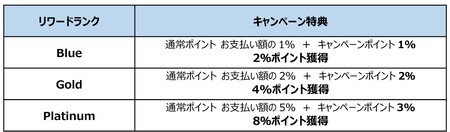 Samsungオンラインショップ(https://www.samsung.com/jp/offer/)にて期間中に対象製品をご購入いただくと、リワードポイントを通常ポイントにプラスして還元いたします。リワードのランクによってポイント還元率(%)は異なります。詳細は以下の表をご確認ください。
