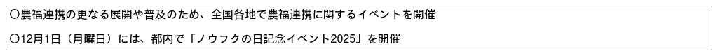 昨年6月に「農福連携等推進会議」(議長:内閣官房長官)において決定された「農福連携等推進ビジョン(2024改訂版)」においては、11月29日(November(ノウ)29(フク))を新たに「ノウフクの日」と制定することとされました。農林水産省は、法務省、文部科学省、厚生労働省と連携し、「ノウフクの日記念イベント2025」や全国での関連イベントの開催等を通じて、農福連携の更なる展開や普及に取り組みます。