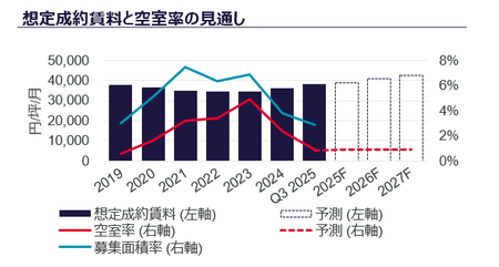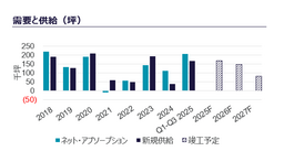 ・ 今後1年間の新規供給量は過去10年平均とほぼ同水準だが、2025年第3四半期末時点の内定率は84.9%に達している。新規供給は2027年にかけて過去10年平均以下の水準となる見込みであり、内定済みの区画も散見される。大規模な空室の発生により空室率が上昇する可能性は限定的。旺盛な需要を受け、 2027年まで空室率は1%台を上限に推移する見通し。