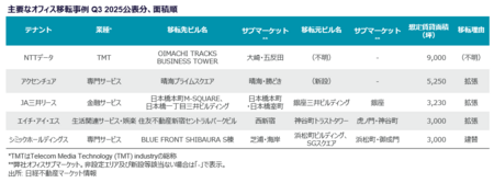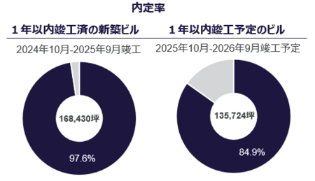 2025年第3四半期末の都心5区グレードAオフィスの年間ネット・アブソープションは前年比62.0%増加の23.6万坪。募集面積率及び空室率はともに低下し、空室率は2020年9月以来となる1%未満となった。募集面積率も直近の最低値(2020年3月時点3.0%)を下回った。二次空室が館内増床で埋め戻される事例が目立ち、既存ビルの募集面積は減少傾向。グレードB以下からのグレードアップ移転や自社ビルからの移転に加え、オフィス拡張目的の移転事例も散見された。2025年第3四半期末時点の竣工1年以内ビルの内定率は97.6%。新築の竣工に伴い募集面積率が高い水準となっている「芝浦・海岸」(30.5%、前年同期比26.5pp)等のサブマーケットでも、中心部の品薄を受け、緩やかな低下が予想される。