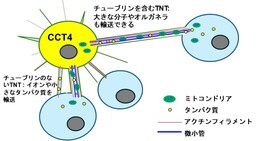 ・CCT4を過剰に発現させると、トンネルナノチューブによって周囲の細胞と繋がり、細胞間のタンパク質とオルガネラを輸送していた。