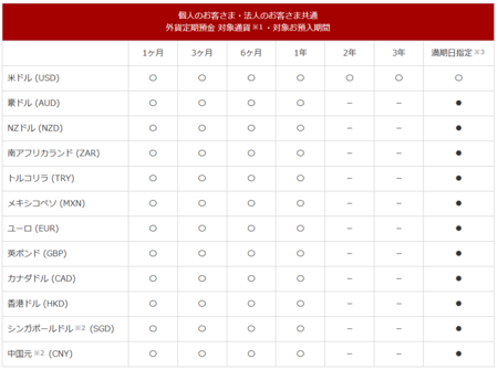 ※1:募集型を除きます。 ※2:シンガポールドル(SGD)・中国元(CNY)は、大和ネクスト銀行の取引サイト上で円普通預金からのお預入れはできません。 ※3:満期日指定方式は、1ヶ月以上1年未満の任意の日付を満期日に設定いただくことが可能です。お預入れをご希望の場合は、大和証券の本・支店・営業所にてお申し込みください。