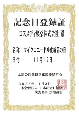 コスメディ製薬株式会社(本社:京都市/代表取締役社長:権 英淑)は、一般社団法人日本記念日協会(事務局:長野県佐久市/代表理事:加瀬 清志氏 )より認定を受け、11月12日を「マイクロニードル化粧品の日」として記念日制定しています。