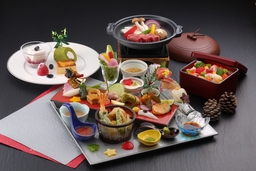 当ホテル最上階に位置する日本料理「あづま」では、静かな和の空間と、窓の外に広がる成田空港のきらめく夜景とともに、季節感あふれる「聖夜パレットコース」でおもてなしいたします。和の繊細な技が光るコースは、大切な方との落ち着いたディナーに最適です。前菜「クリスマスパレット」は、旬菜・旬魚にクリスマスのテイストを施した一皿に仕上げました。きらめきを閉じ込めた色とりどりの華やかな一品です。メイン料理には滋味深い「国産牛の陶板焼き」、お食事には聖夜を美しく表現した「ばらちらし寿司」をお召し上がりいただけます。ひとつひとつに心を込めたおもてなしとともに、心に残るディナータイムをお過ごしいただけます。
