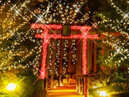 並ぶ鳥居が光で彩られ、まるで光のトンネルのように幻想的。