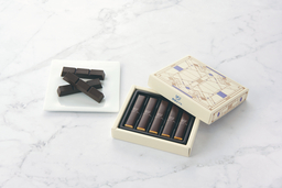 帝国ホテル 東京の館内にあるステンドグラスをイメージしたデザインの紙箱に、スティックのビターチョコレートを詰めました。紙箱は、ブルーをアクセントに使用したシックなデザインで、自分へのご褒美やちょっとしたプレゼントにもおすすめです。スティックチョコレートは、帝国ホテル2代目本館(通称「ライト館」)の外壁のスクラッチタイルを模しており、ほどよい厚みと歯応えが特長です。