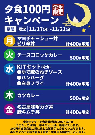 学生「夕食100円」(学生限定)キャンペーン