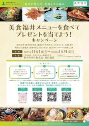 福井県は、代表的な県産食材24品目を「美食福井」食材と位置付け、全国的な認知度向上、販路拡大に向けた取り組みを行っています。このたび、福井県の公式観光サイト「ふくいドットコム」にて、「美食福井」食材を使用する県内の飲食店・宿泊施設の掲載を始めました。使用する食材やエリアで検索できるのが特徴です。また、掲載開始に合わせて、掲載店を対象にしたSNSキャンペーンも開始しました。