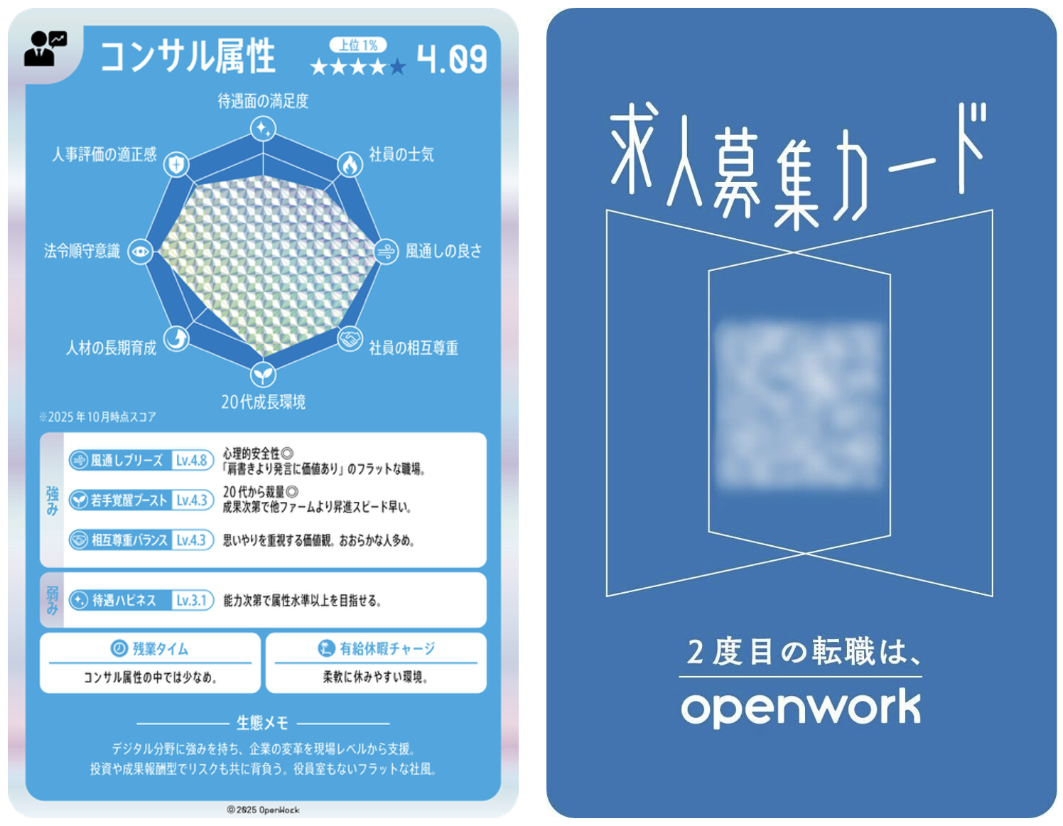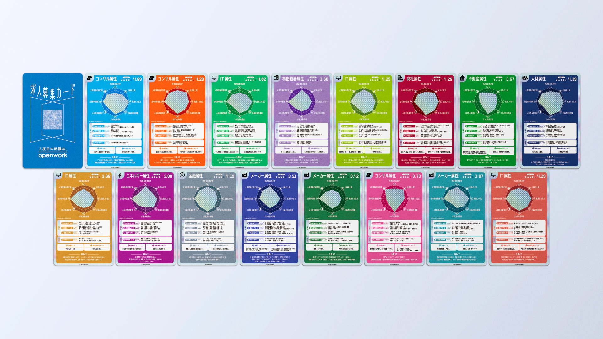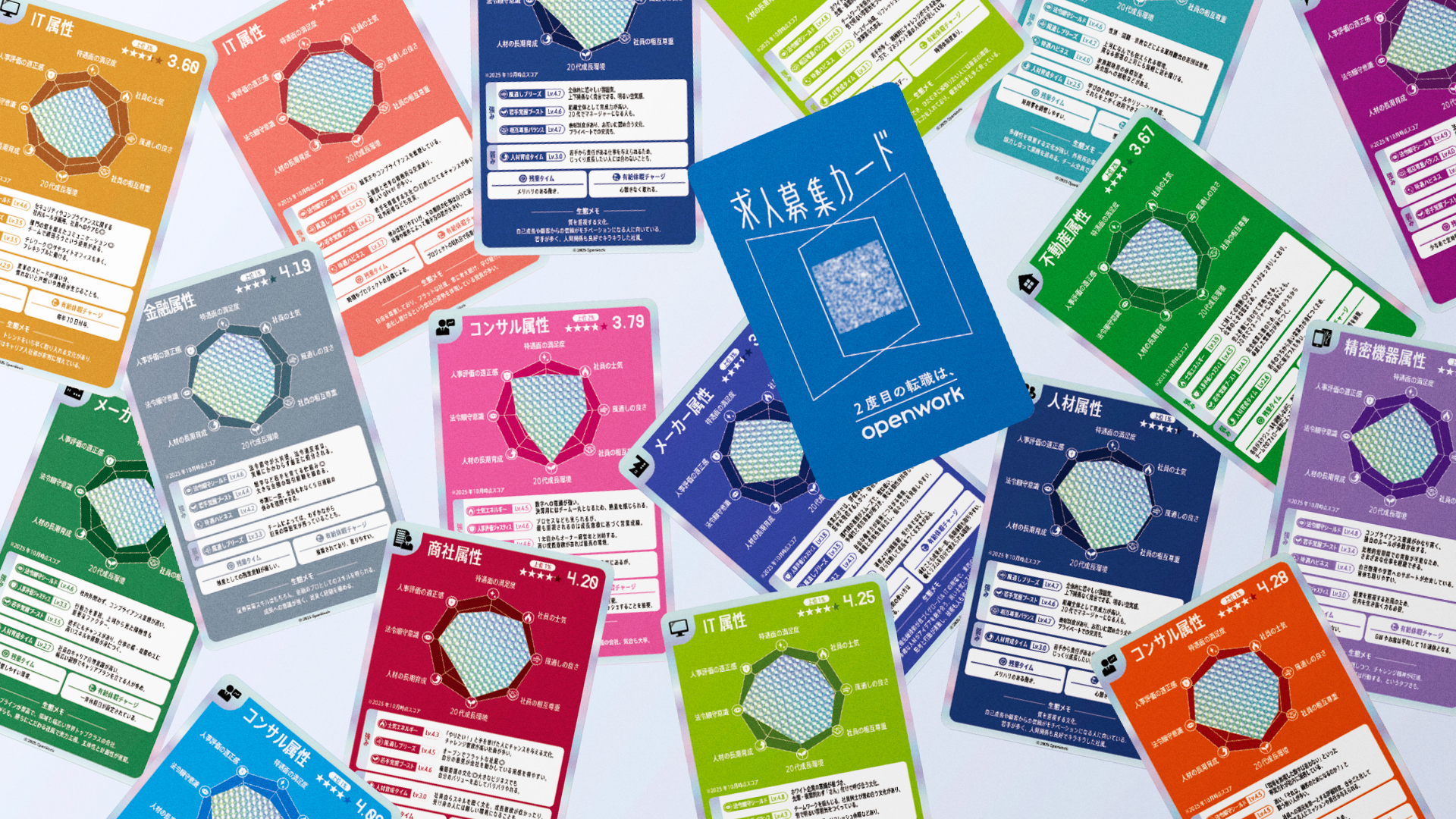 本広告は、OpenWorkに投稿された社員・元社員が考える企業の「強み」や「弱み」が書かれたカード型の求人票をピールオフできる広告で、OpenWorkが保有するクチコミや評価といった膨大なデータをもとに“リアルな企業の姿”をカードとして見える化しました。カードには、企業名や給与といった就職や転職にとって重要な情報はあえて伏せています。先入観にとらわれず、企業の強みや弱みをフラットに捉えることで、ゲームのように楽しみながらも自分に合う会社を考えるきっかけになるようなデザインにしています。